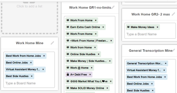 Board names that are blue are my boards. The green highlighted lists are group boards.